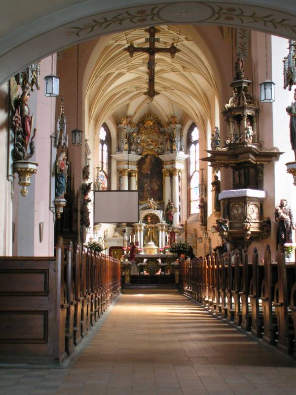 Gotycka budowla pochodzi z XV wieku. W kościele i jego otoczeniu na uwagę zasługują: ołtarz główny z obrazem przedstawiającym św. Annę z rodziną. Obraz został namalowany w 1701 roku przez nadwornego malarza biskupów wrocławskich Johanna Clayssensa z Antwerpii; nagrobek księcia Karola I i jego żony Anny Żagańskiej w kaplicy Kauffunga; bogato zdobiona manierystyczna ambona z 1619 roku; kaplica św. Anny, której barokowy wystrój pochodzi z 1772 roku.