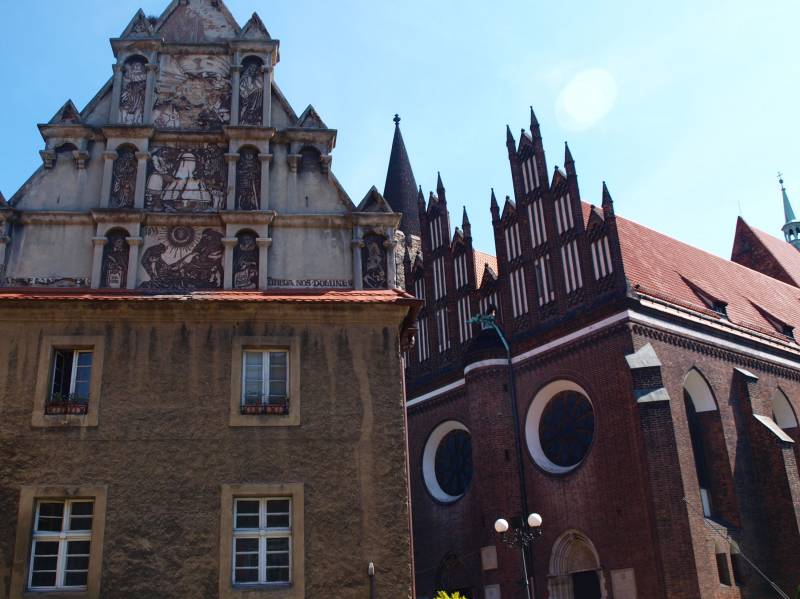 Budova nejstarší školy ve městě byla postavena v roce 1565, v renesančním slohu. Funkce školy plnila až do roku 1881, kdy se stala majetkem farnosti. Pozornost si zaslouží zejména dva zdobené štíty z roku 1925, sgrafitovou dekoraci, která představuje patronů města a Slezska a nejvýznamnější událostí v historii Minsterberku. Na východní straně fasády se nacházejí geometrické dekorace s obrazem Ježíše a slunečními hodinami.