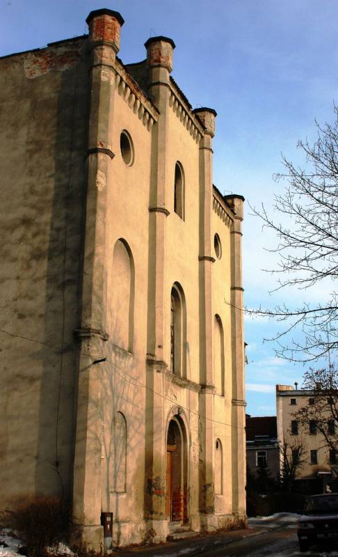 The Münsterberg Synagogue was built in 1845. The temple was designed by architect Tischler of Breslau in English Gothic style which was seldom seen in Silesia at the time. The interior of the main sanctuary is flanked by wooden matronea. There are also two commemorative plaques inside the synagogue, dedicated to Berta and Julius Schottländer, the benefactors of Münsterberg.