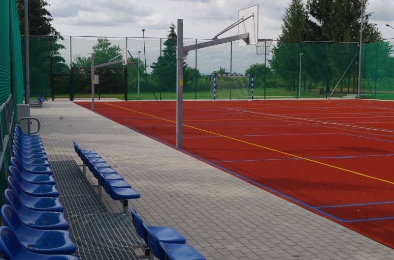 Boiska do piłki nożnej, ręcznej i koszykówki oraz bieżnia znajdują się obok budynku szkoły podstawowej przy ulicy Polnej.