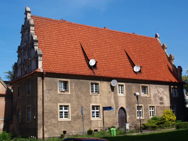 The building of the oldest school in Münsterberg was built in 1565 in Renaissance style. It served as a school until 1881 when it was taken over by the local parish. The building features in particular the two gables, which in 1925 were decorated with a sgraffito painting of the holy patrons of the town and Silesia, and depictions of the key moments in Münsterberg history. The eastern façade is decorated with sgraffito painting of geometric figures with the image of Christ and a sundial.